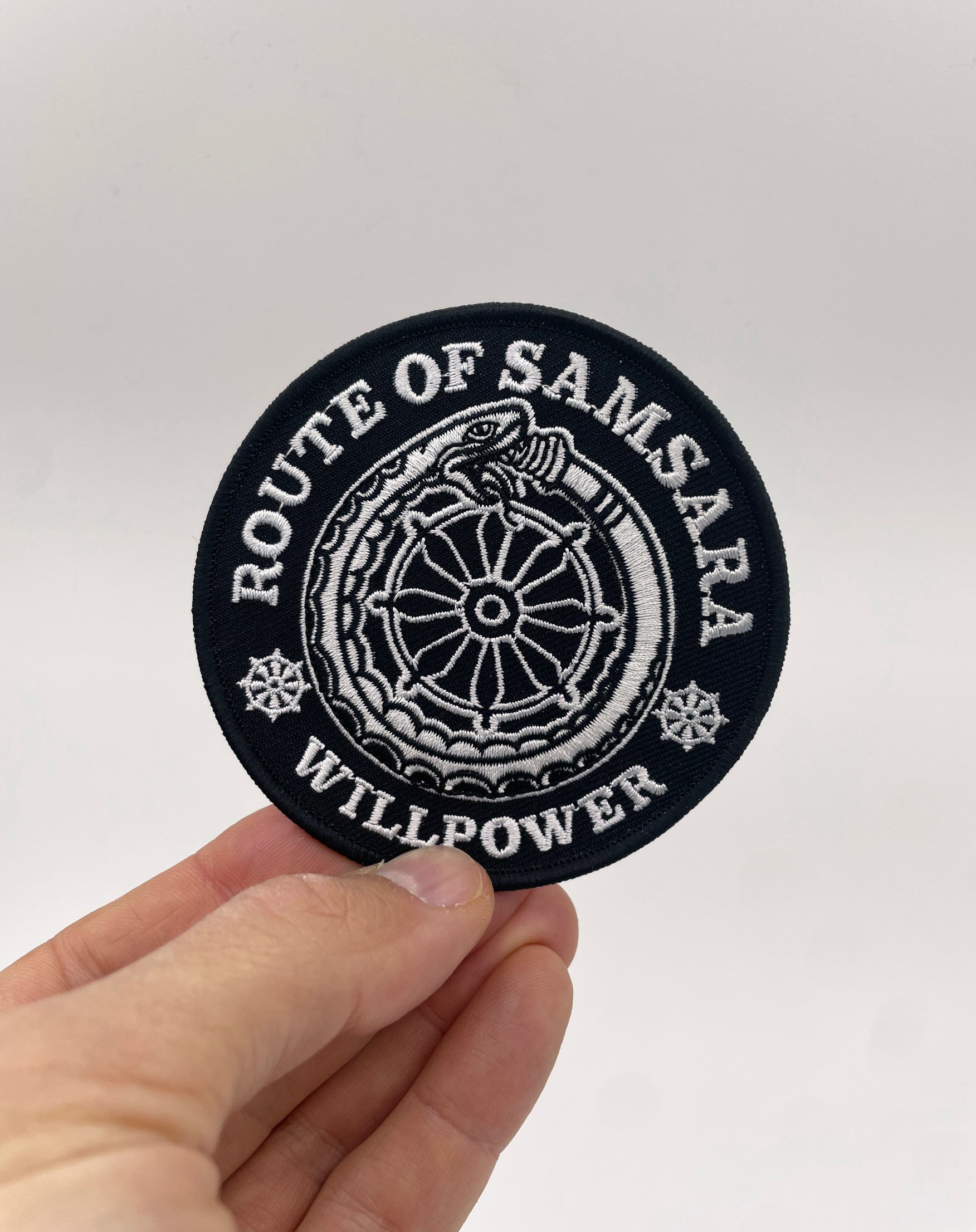 9 cm (3.7 inch) sized "Route of Samsara" Patch with a "sticky" back, which means you can iron it or sew it, as you wish.